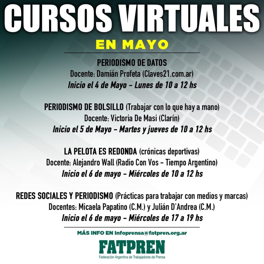 Durante mayo y junio se dictarán cursos virtuales de capacitación para afiliades. Las temáticas serán Redes sociales, Periodismo de datos, Crónicas deportivas y herramientas para periodistas. Ante las dificultades que impone el aislamiento social obligatorio, en el marco de la pandemia del coronavirus, decidimos organizar cursos virtuales para que nuestros afiliados y afiliadas puedan seguir […]