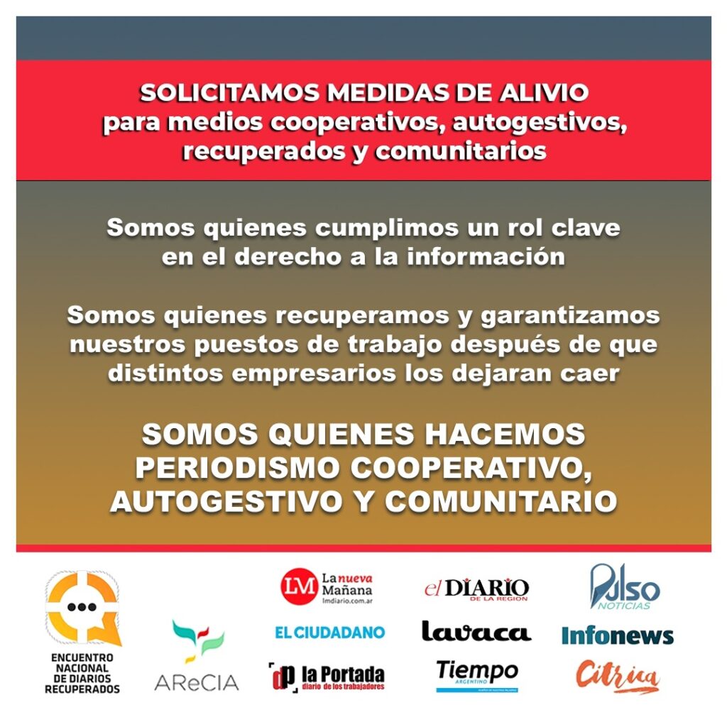 La Federación Argentina de Trabajadores de Prensa (FATPREN) acompaña el reclamo de los medios cooperativos, autogestivos, recuperados y comunitarios quienes solicitan medidas de alivio para el sector en el marco del agravamiento de la crisis económica. Las y los trabajadores de prensa de estos medios de comunicación tienen un rol fundamental para el derecho a […]