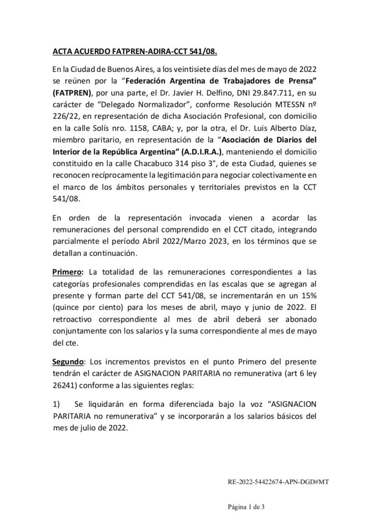 Acuerdo entre el delegado normalizador y ADIRA por la paritaria del CCT 541/08