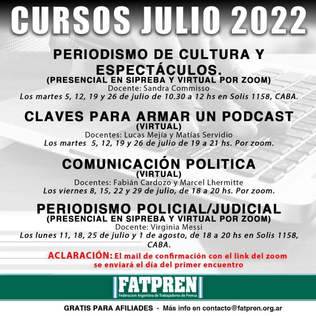 En julio de 2022 retomamos las actividades de capacitación para afiliades de los sindicatos de base de la Federación Argentina de Trabajadores de Prensa (FATPREN). Algunos cursos se brindarán en forma presencial, otros en forma mixta (presencial y virtual) y otros en formato virtual por Zoom. Una vez completa la inscripción, el día de la […]