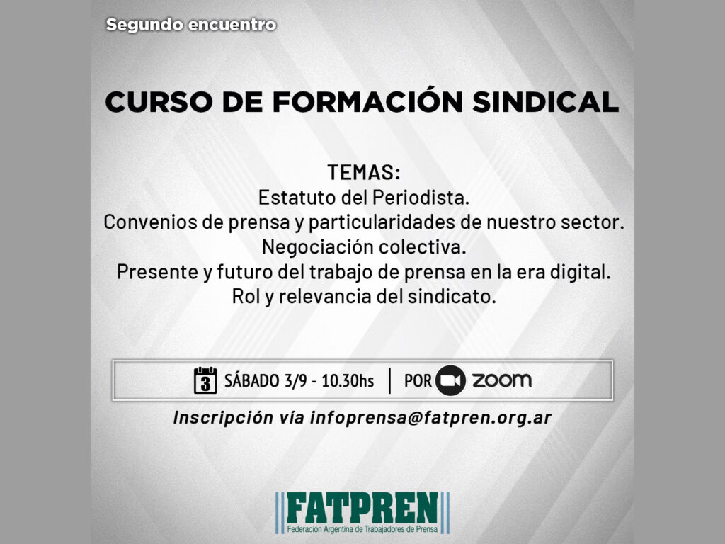 La Federación Argentina de Trabajadores de Prensa (FATPREN) convoca al segundo encuentro del Curso de Formación Sindical. Será el sábado 3 de septiembre a las 10.30, vía Zoom. Durante el encuentro se abordarán los siguientes temas: Estatuto del Periodista; Convenios de prensa y particularidades de nuestro sector; Negociación colectiva; Presente y futuro del trabajo de […]
