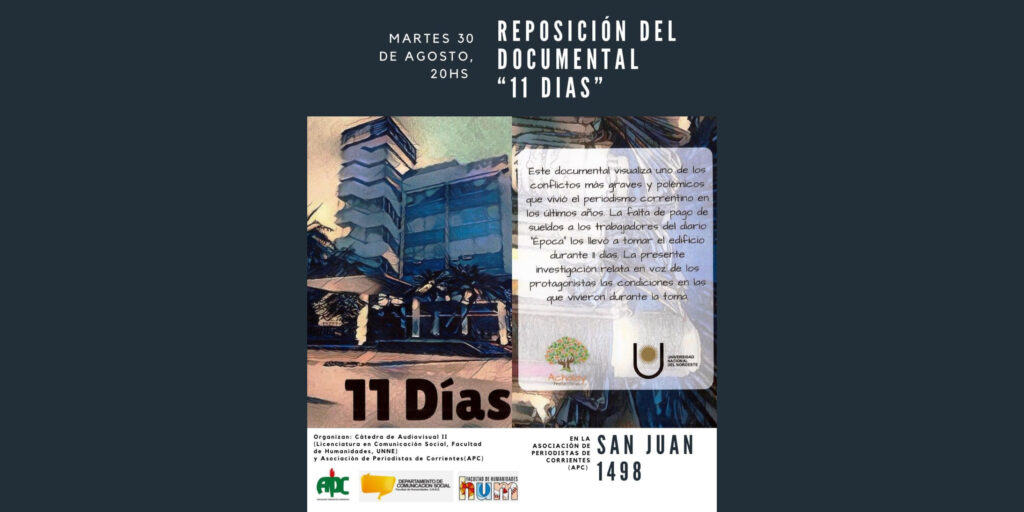 Este martes 30 de agosto, a las 20.00, se repondrá el documental «11 Días», en la sede de la Asociación de Periodistas de Corrientes (APC), en San Juan 1498 de la capital provincial. En 2022 se cumplen 20 años de uno de los conflictos sindicales periodísticos más graves de la provincia y la reposición de […]