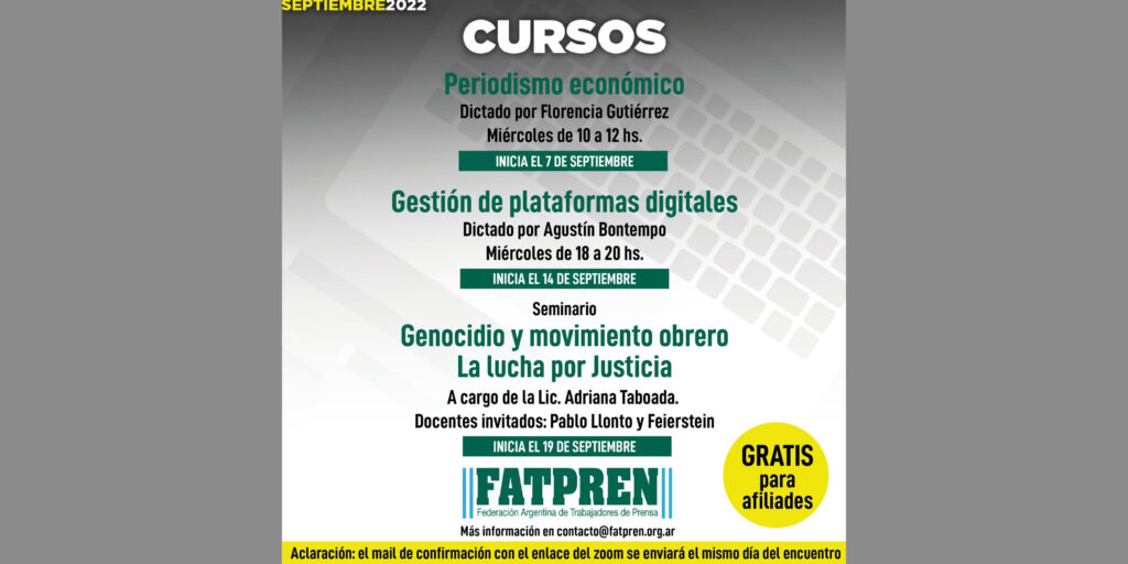 En septiembre de 2022 vuelven las actividades de capacitación para afiliades de los sindicatos de base de la Federación Argentina de Trabajadores de Prensa (FATPREN). Los cursos se brindarán en formato virtual por Zoom. Una vez completa la inscripción, el día de la primera clase les alumnes recibirán por correo electrónico los detalles y los […]