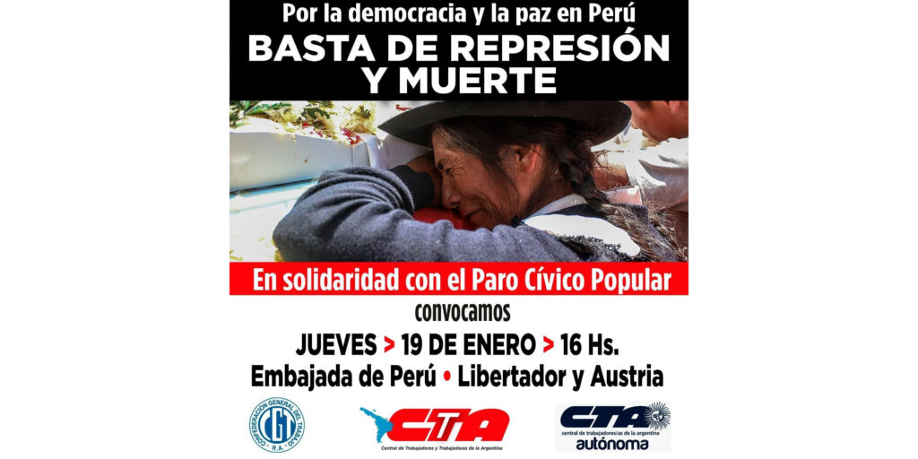 Desde la Federación Argentina de Trabajadores de Prensa (FATPREN), junto a las tres centrales sindicales de nuestro país, convocamos a concentrarnos este jueves 19 de enero, a las 16.00, frente a la embajada de Perú para respaldar al pueblo peruano y reclamar por el cese de la represión en su contra que hasta el momento […]