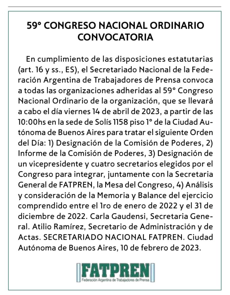 La Federación Argentina de Trabajadores de Prensa convoca a todas las organizaciones adheridas al 59° Congreso Nacional Ordinario de la organización, que se llevará a cabo el día viernes 14 de abril de 2023, a partir de las 10:00hs en la sede de Solís 1158 piso 1° de la Ciudad Autónoma de Buenos Aires para […]