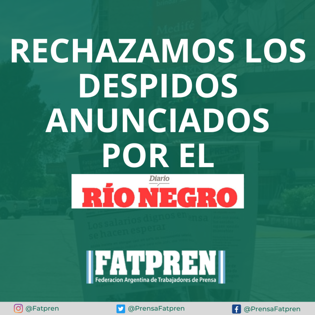 Desde la Federación Argentina de Trabajadores de Prensa (FATPREN) repudiamos los despidos anunciados el lunes 27 de febrero por el Diario Río Negro. Mediante una comunicación interna la empresa informó que su decisión de “llevar adelante un ajuste de estructura del orden del 10%”.Esta medida del Diario Río Negro tiene por objeto avanzar sobre las […]