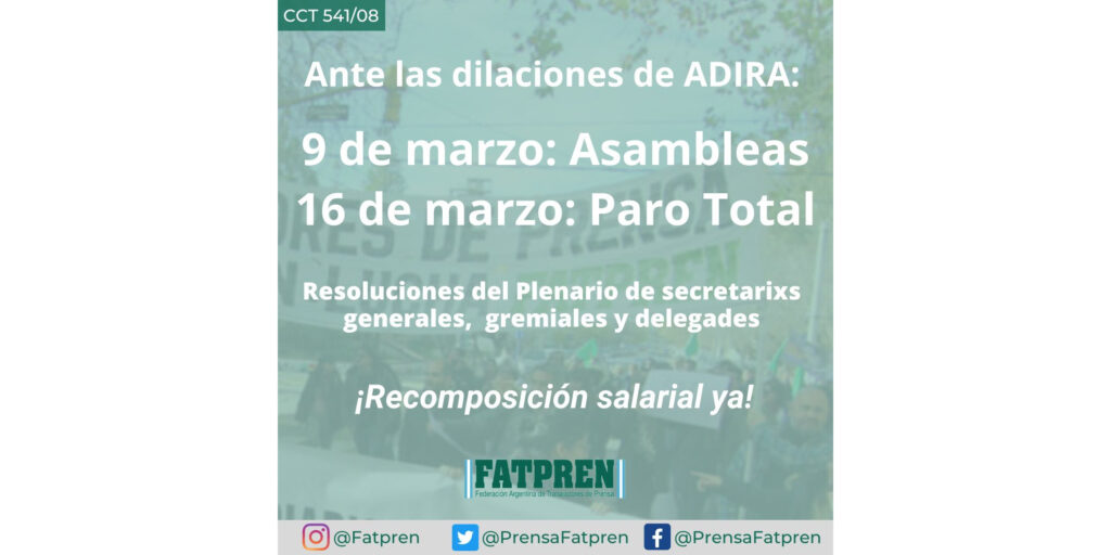Este lunes 6 de marzo se realizó un plenario de secretarios/as generales, gremiales y delegados/as de la Federación Argentina de Trabajadores de Prensa (FATPREN) para evaluar la situación de la negociación paritaria del Convenio Colectivo de Trabajo (CCT) N° 541/08. Participaron de la instancia representantes de los sindicatos de prensa de La Plata, Viedma, Neuquén, […]