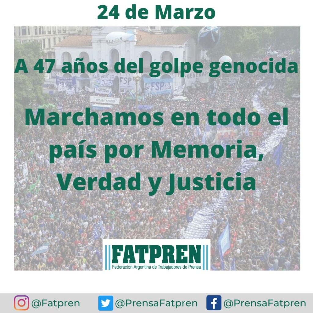 *Por Fernando Díaz, secretario de DDHH de FATPREN Este 24 de marzo se cumplen 47 años del inicio de la última dictadura cívico-militar en la Argentina y 40 años del regreso a la democracia. La Secretaría de Derechos Humanos de la Federación Argentina de Trabajadores de Prensa junto a los sindicatos adheridos de todo el […]