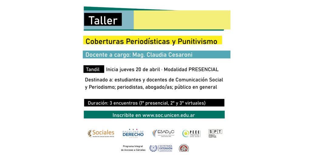 Mañana jueves 20 de abril, a las 19, en el Consejo Académico de la Facultad de Arte de la UNICEN (9 de Julio 430 – Tandil) la doctora Claudia Cesaroni brindará una charla-taller denominada «Coberturas periodísticas y punitivismo», destinada a profesionales de la comunicación y del Derecho, periodistas, docentes y estudiantes. La propuesta es organizada […]