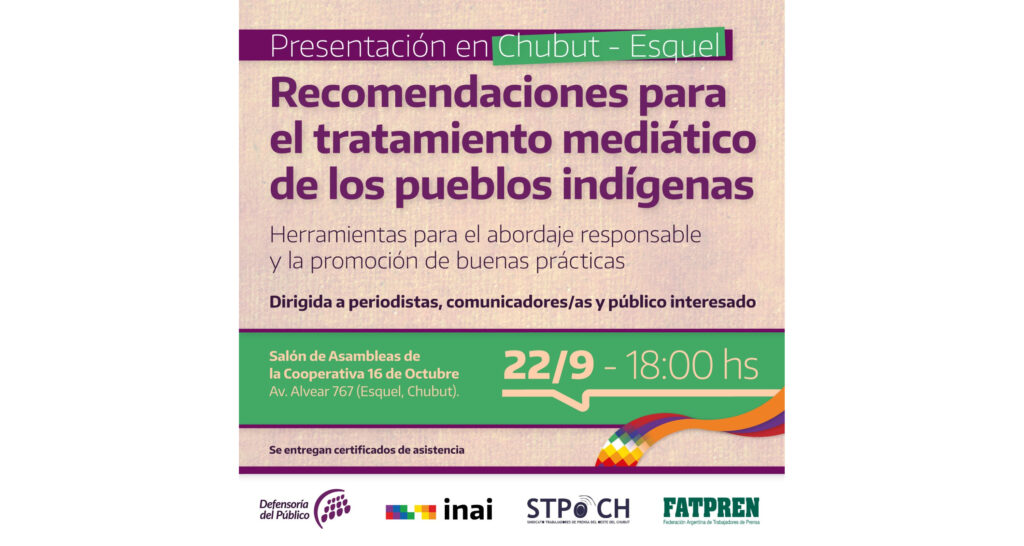 El próximo viernes 22 de septiembre, a las 18.00, se realizará en Esquel una capacitación para abordar «Recomendaciones para el tratamiento mediático de los pueblos indígenas», organizada por la Federación Argentina de Trabajadores de Prensa (FATPREN), el Sindicato de Trabajadores de Prensa del Oeste del Chubut (STPOCh), la Defensoría del Público y el Instituto Nacional […]