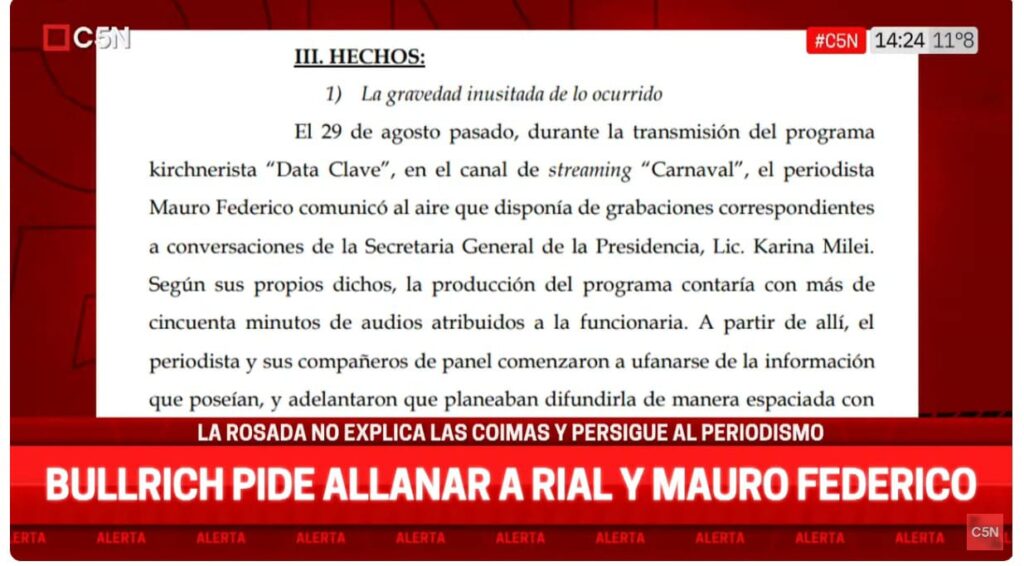 La Federación Argentina de Trabajadores de Prensa expresa nuestro más enérgico repudio al pedido de la ministra de Seguridad, Patricia Bullrich, a la Justicia de allanar a los periodistas Mauro Federico y Jorge Rial. Del mismo modo, rechazamos la medida cautelar otorgada que prohíbe la difusión de los audios que involucran a funcionarios de gobierno, […]