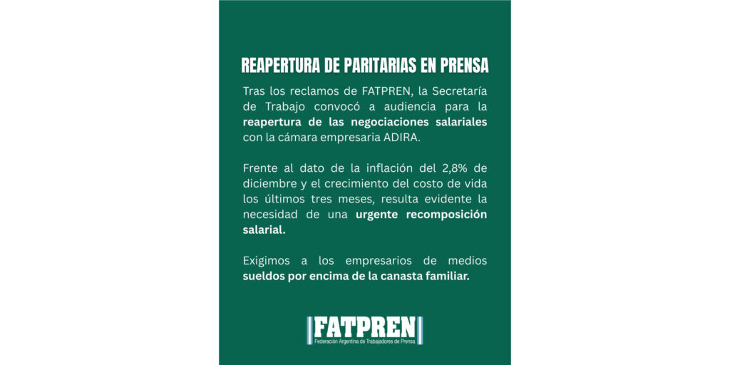 Tras los reclamos de la Federación Argentina de Trabajadores de Prensa (FATPREN), la Secretaría de Trabajo convocó a audiencia para la reapertura de las negociaciones salariales con la cámara empresaria ADIRA. Frente al dato de la inflación del 2,8 % de diciembre y el crecimiento del costo de vida los últimos tres meses, resulta evidente […]