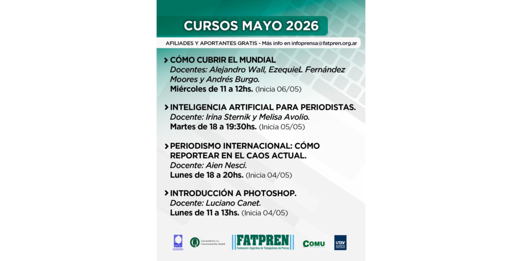 En mayo comienzan los talleres gratuitos de capacitación 2026 para quienes son afiliados a sindicatos de la Federación Argentina de Trabajadores de Prensa (FATPREN) o aportantes convencionales del CCT N° 541/08. Informes e inscripción: infoprensa@fatpren.org.ar Cómo cubrir el mundial ¿Cuándo?Miércoles 6, 13 y 20 de mayo. De 11 a 12 hs. Planificación: Primer encuentroUn recorrido […]