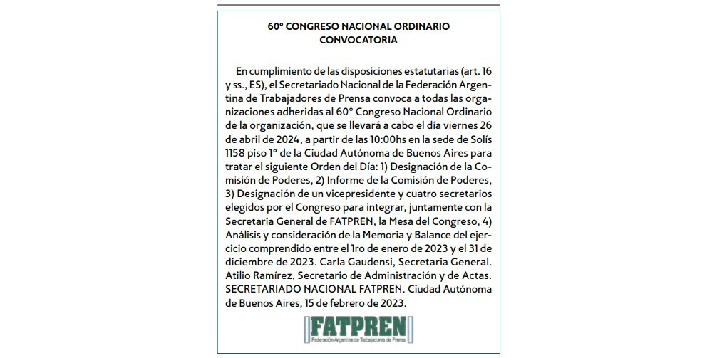Interior/Organización Convocatoria al 60° Congreso Nacional Ordinario de la FATPREN Leer Más » 19 de febrero de 2024