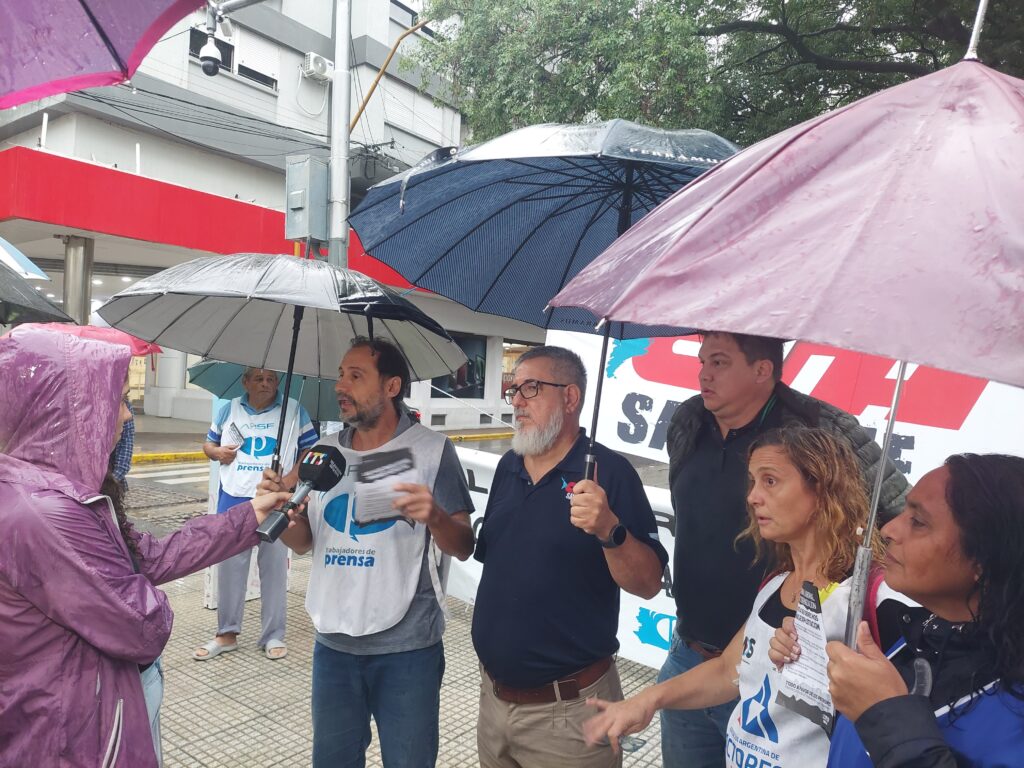 En Santa Rosa, compañeres del Sindicato de Prensa de La Pampa Zona Sur se sumaron a la conferencia de prensa que se realizó en reemplazo de la marcha cancelada por circunstancias climáticas.