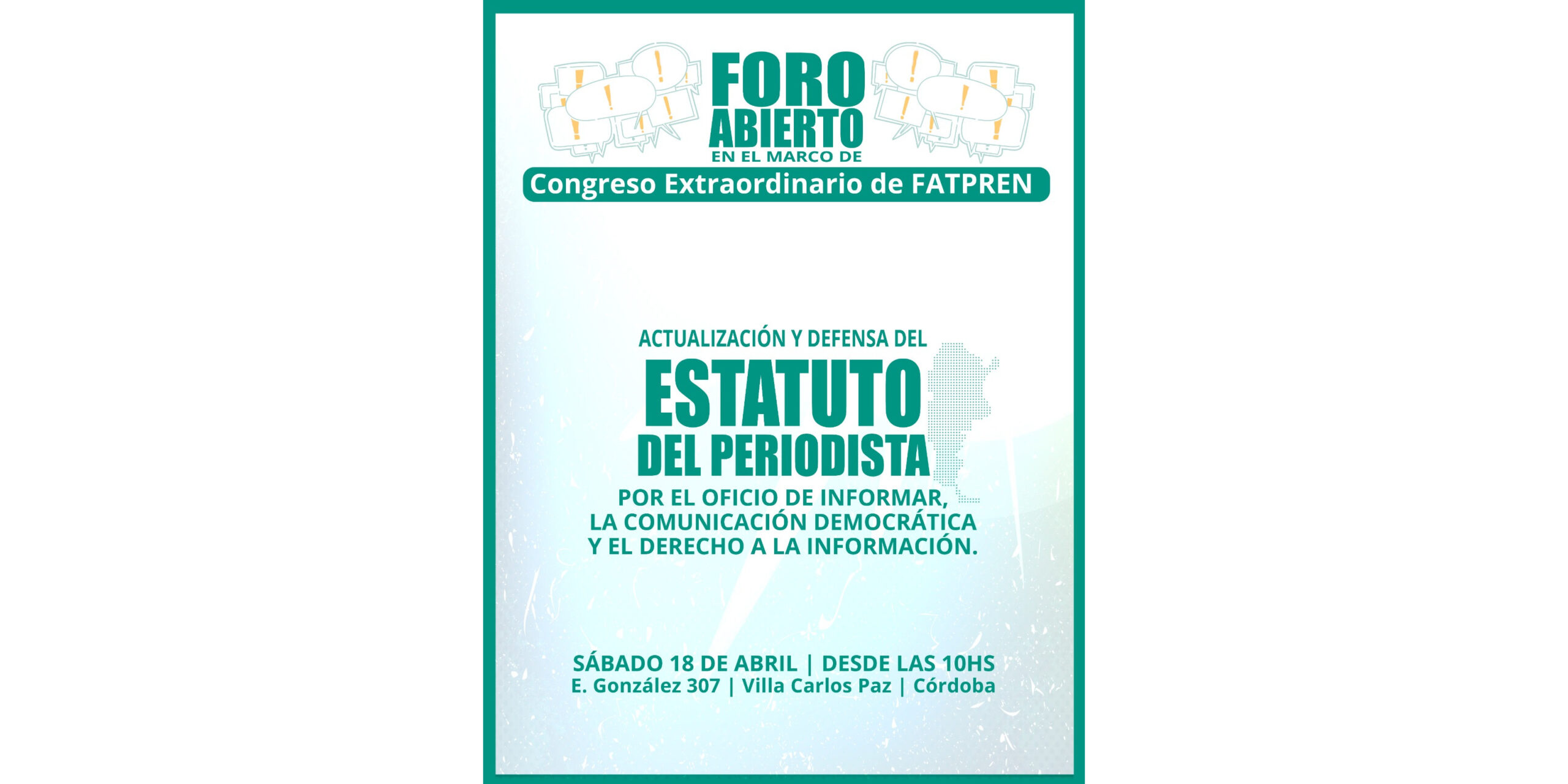 En el marco del Congreso de la Federación Argentina de Trabajadores de Prensa (FATPREN), que se realizará en la provincia de Córdoba los días 17 y 18 de abril, el sábado 18 convocamos a todos los sectores de la comunicación a un foro abierto para avanzar sobre una propuesta integral de defensa del Estatuto del Periodista.